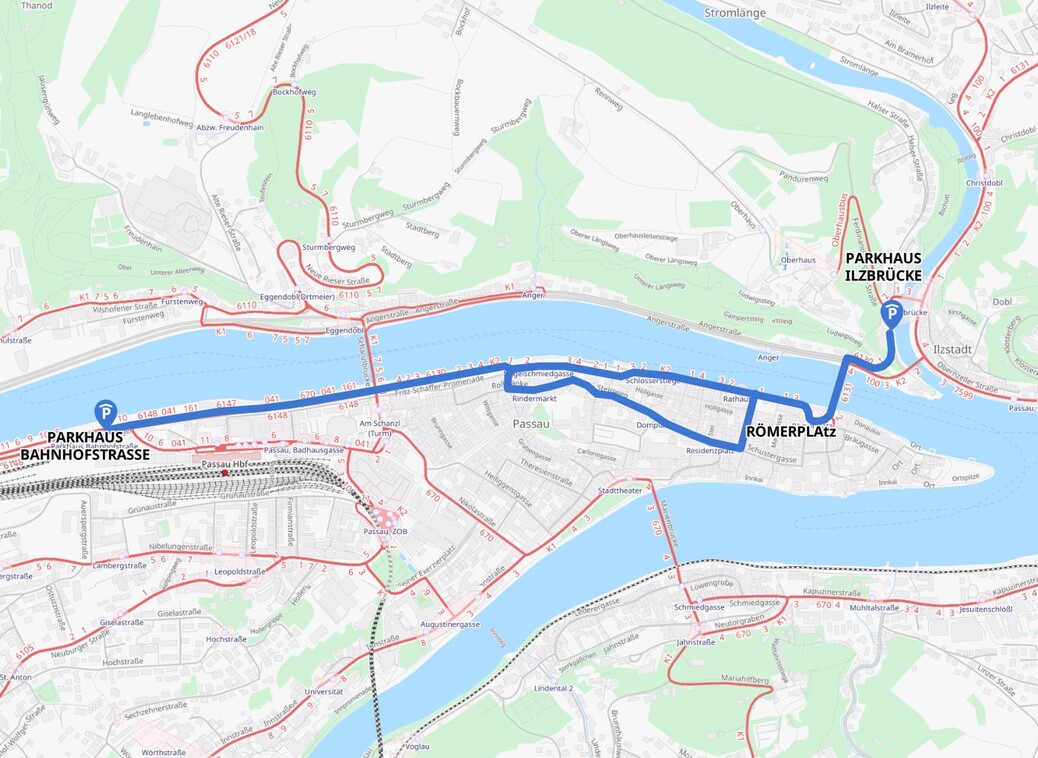 Passau - Der Aufschrei über die abgeschnittene Altstadt verliert an Gewicht. Das ist die neue Strecke, die mit Kleinbussen der K-Linien bedient wird: Parkhaus Bahnhofstraße – ZOB – Römerplatz – Salvatorkirche – zurück. Gefahren wird im gewohnten Rundkurs, auch durch die Altstadt. Der Kleinbus – er darf über die Hängebrücke – fährt