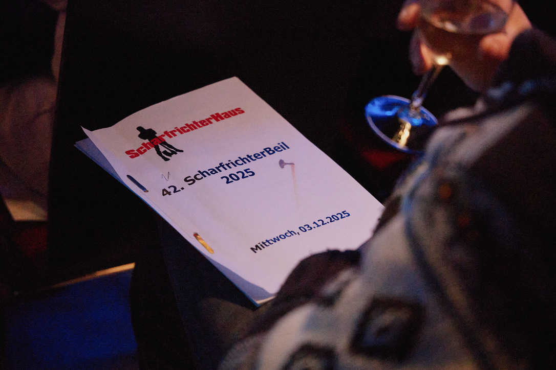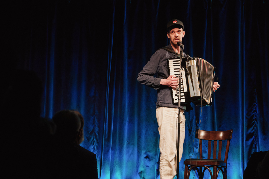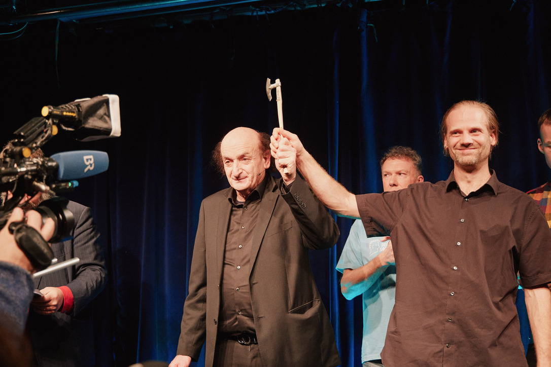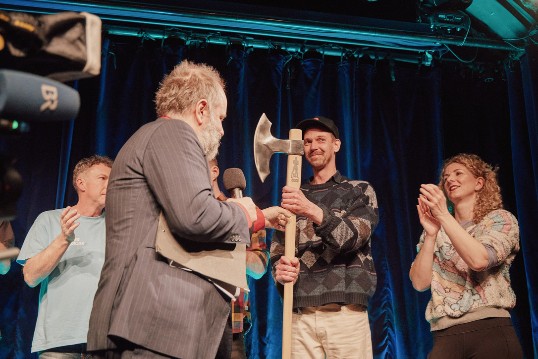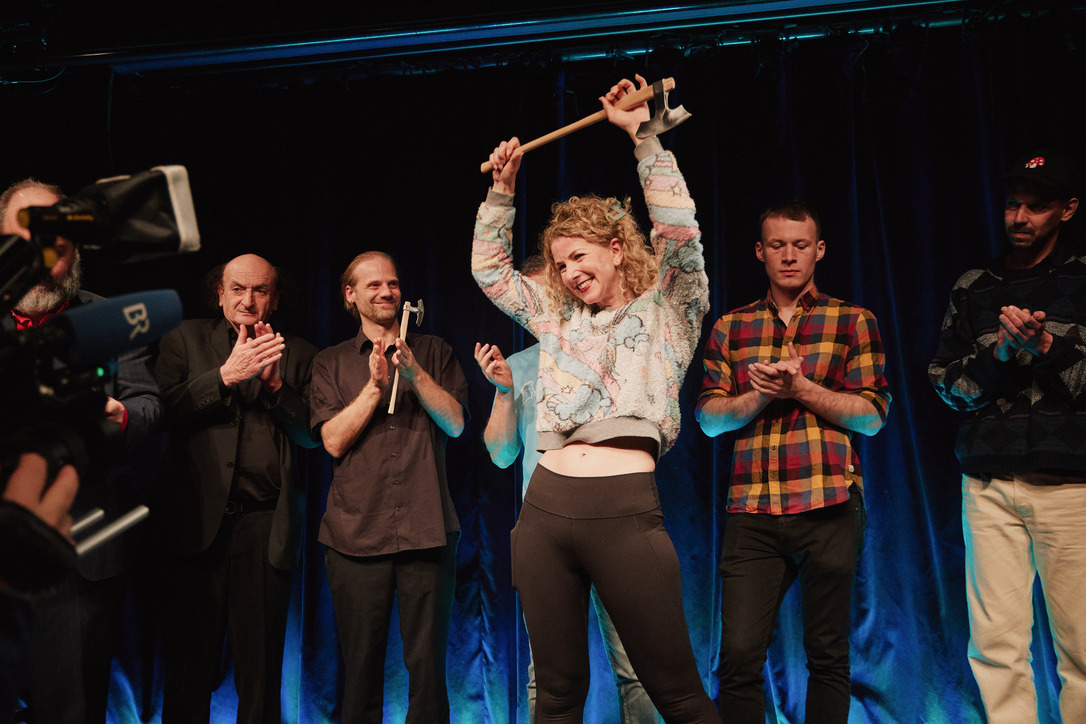 Passau - Jury und das Publikum waren sich einig: Der Mann aus Oberammergau, der mit seinem Akkordeon von seiner persönlichen Passion singt und erzählt, gewinnt das große Scharfrichterbeil 2025. (Fotogalerie Stefan Schopf/ Bürgerblick)