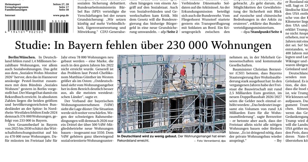 Wohnungsnot und Leerstand: Warum die Neubau-Debatte zu kurz greiftPassau/ Berlin - Heute diskutiert der Deutscher Bundestag über „Schrottimmobilien“ – während die Tagespresse eine Studie verbreitet, die vor allem eines fordert: Neubau. Wie belastbar diese Zahlen sind und was sie ausblenden, zeigt der Blick nach Bayern. Der „Soziale Wohn-Monitor 2026“ des Pestel-Institut beziffert den Fehlbedarf im Freistaat auf 233.000 Wohnungen. Auftraggeber ist das „Bündnis Soziales Wohnen“, ein Zusammenschluss unter anderem aus Deutschem Mieterbund und IG BAU. Die Stoßrichtung ist klar: mehr Neubau, insbesondere im sozialen Wohnungsbau.